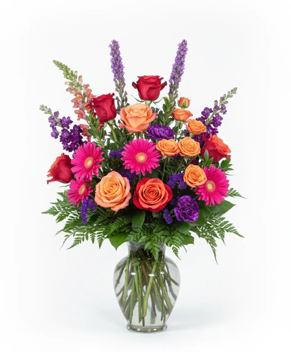 Experience the breathtaking beauty of a 'Sunset Serenade' with this vibrant floral arrangement, bursting with warm oranges, fiery pinks, and enchanting purples. Each bloom, from the elegant Cherry Brandy Rose to the cheerful Gerbera Daisy, creates a symphony of color and joy. Perfect for brightening any space or celebrating a special moment, this bouquet is a true masterpiece of nature's artistry.