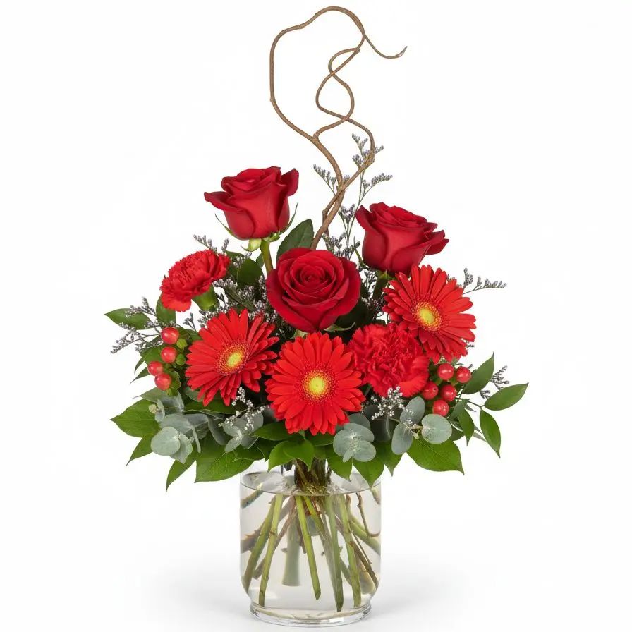1 Curly Armature Pick 3 Red Roses 3 Red Mini Gerbera 2 Red Carnations 1 Red Mini Carnation 1 Red Hypericum 0.5 Limonium 0.5 Seeded Eucalyptus 0.25 Myrtle 0.25 Pittosporum